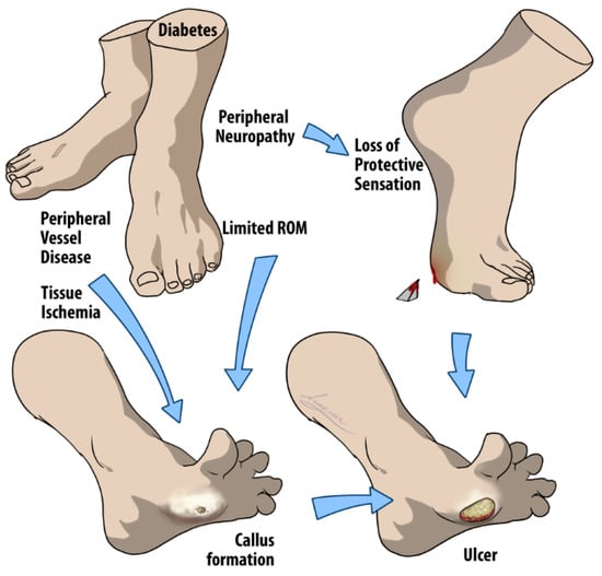 Multifactorial pathways to DFU development. The arrows in the figure suggest a progression and/or causal relationship between the conditions listed, leading to the formation of a DFU. Initially, diabetes can cause peripheral neuropathy in the feet that leads to a loss of protective sensation, preventing individuals from feeling injuries. Concurrently, diabetes may induce peripheral vessel disease, which compromises blood circulation and causes tissue ischemia, depriving tissues of necessary oxygen and nutrients. The combination of these factors, along with limited ROM, contributes to abnormal pressure distribution on the feet. This abnormal pressure often results in callus formation, which, if left unchecked, can result in open wounds due to the body’s diminished ability to heal itself effectively, thus completing the multifactorial process of DFU development.