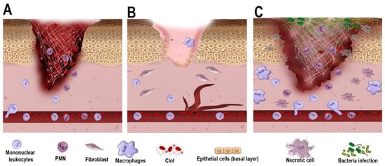 Cellular and molecular mechanisms of wound healing in acute vs. chronic wound healing. (A). As trauma occurs, the acute wound undergoes blood clot formation with the early infiltration of polymorphonuclear (PMN) cells and mononuclear leukocytes (e.g., monocytes). The blood clot serves as a scaffold for cell migration and the temporary closure of the wound. (B). In a non-diabetic environment, as healing progresses, fibroblasts promote wound contraction, and epithelial cells from the basement membrane proliferate towards wound closure. Macrophages contribute to removing debris and secrete growth factors that further aid in wound closure. (C). In a diabetic environment, owing to poor vascularization and dysregulated inflammatory response, cell proliferation and wound contraction are delayed. PMN and macrophages also exhibit a defective response, favoring bacterial infection, necrosis, and impaired healing.