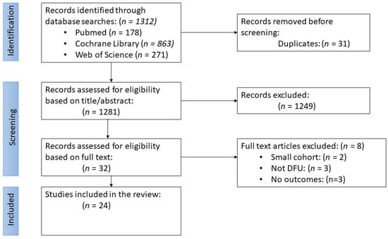 The initial literature search yielded 1312 articles: 178 from PubMed, 863 from Cochrane Library, and 271 from Web of Science [Figure 3]. After removing duplicates, 1281 abstracts were screened for their eligibility, which resulted in the exclusion of 1249 articles. The remaining 32 were placed through a full-text screening, and 8 more were removed. 24 articles were ultimately included in this review. Seven studies were potentially relevant but excluded due to the small cohort size or comparing outcomes not listed in our inclusion criteria; in [] the authors compared a BSS to a fetal bovine collagen dressing for treating venous leg ulcers [Figure 3]. Other trials had the required number of patients; however, they did not investigate our outcomes of interest [].