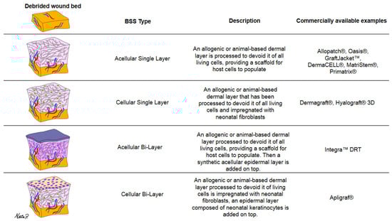 Over the past decade, tissue engineering has advanced significantly, resulting in alternative wound care strategies such as BSS [,]. Theoretically, BSSs hold great potential for enhancing the healing process of DFUs by providing a scaffold for cell growth and proliferation, immunomodulation, promoting angiogenesis, and stimulating tissue regeneration []. BSSs aim to address the primary challenges inherent in all three preceding methods—autografts, allografts, and xenografts—namely, issues related to donor morbidity and deficiency, susceptibility to infection, and the potential for immunogenic rejection [,]. These types of engineered grafts can be described as skin analogs created in a laboratory, and share some of the same biological and pharmacological properties as human skin [,]. In this scoping review, we will initially delineate the various BSSs employed as grafting alternatives for DFUs, followed by a thorough summarization of the evidence regarding their applications in human subjects.