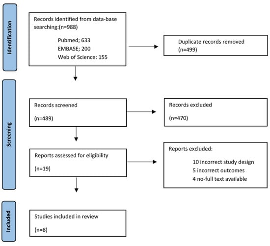 In total, 988 articles were identified and 499 duplicate articles were excluded. Thereafter, the study titles and abstracts were screened, resulting in 19 studies being eligible for full-text review. Of these, eight studies met the eligibility criteria and were included [,,,,,,,]. The PRISMA flow chart is illustrated in Figure 1. Overall, six studies were prospective cohort studies [,,,,,], and the remaining two studies were retrospective cohort studies [,]. Only one study used a control group []. The primary outcome was the identification of lesions suspicious for malignancy in asymptomatic TP53 carriers in seven studies, whilst Kagami et al. defined the primary outcome as radiological findings leading to follow-up imaging or intervention in asymptomatic TP53 carriers [].