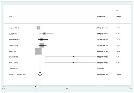 Overall, 44 new lesions were identified in 36 patients with WB-MRI (36/506 (7.1%)) and subsequently confirmed as cancer. The overall pooled proportion of cancer detected on MRI was 7% (95% CI 5–10) (Figure 2). The distribution of cancer diagnosis by location was as follows: 16 abdominal, 10 chest, 4 brain, 4 neck, 4 pelvis, 3 lower limb, 2 upper limb and 1 breast. Five studies specified whether the cancer was identified on the initial or follow-up WB-MRI scan [,,,,]. Nine malignant lesions (in nine patients) that were not present on the initial scan were diagnosed during follow-up WB-MRI. The most common cancers were renal cell carcinoma, osteosarcoma, colorectal adenocarcinoma and astrocytoma. The confirmation of cancer in all studies was performed through a combination of further imaging and subsequent tissue specimen for histological diagnosis. See Table 3 for lesion diagnosis by body distribution and Table 4 for a descriptive overview of the types of cancer.