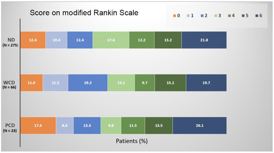 All patients were evaluated using the NIHSS 24 h after the procedure and at discharge. The average NIHSS scores after 24 h and at discharge were similar in the three analyzed groups (8.4 in ND group, 8.1 in WCD group and 9.2 in PCD group 24 h after MT and 7.5 in ND group, 8.0 in WCD group and 8.4 in PCD group at discharge). The mean hospitalization time was 11.8 days (from 1 to 60 days) for the ND patients and 11.4 (from 2 to 49 days) for the WCD patients. The mean hospitalization time for the PCD patients was prolonged to an average of 14.3 days (from 2 to 52 days) (PCD vs. ND, p < 0.05; PCD vs. WCD, p < 0.05). In 29 (10.5%) of the ND patients, 8 (12.1%) of the WCD patients and 4 (17.4%) of the PCD patients, hematoma at the site of the arterial puncture occurred, with 1 patient from the ND group requiring surgical intervention.