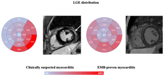 - Pommier, T.; Leclercq, T.; Guenancia, C.; Tisserand, S.; Lairet, C.; Carré, M.; Lalande, A.; Bichat, F.; Maza, M.; Zeller, M.; et al. More than 50% of persistent myocardial scarring at one year in “infarct-like” acute myocarditis evaluated by CMR. J. Clin. Med. 2021, 10, 4677. [Google Scholar] [CrossRef] [PubMed]