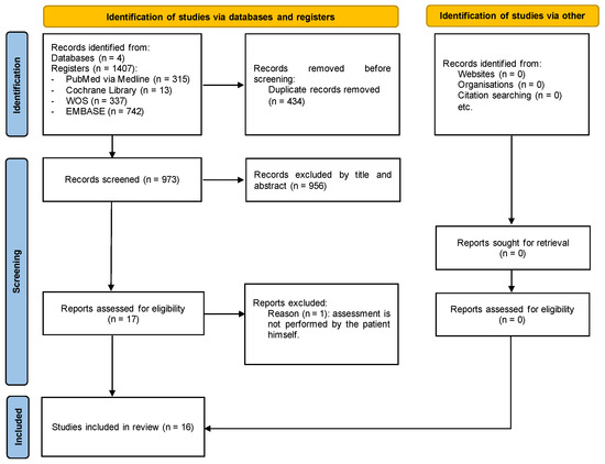 The search, screening, and eligibility processes are described in Figure 1. Initially, 1407 articles were retrieved from the search, none of which were cross-referenced. After removing duplicates, 973 articles were analyzed by title and abstract, resulting in 17 articles being selected for full reading. After fully reading the articles, it was found that one article did not evaluate the patient’s perspective, as the quality of life assessment was carried out by family members, leading to the exclusion of this article. Thus, sixteen articles were included in this review (Figure 1).