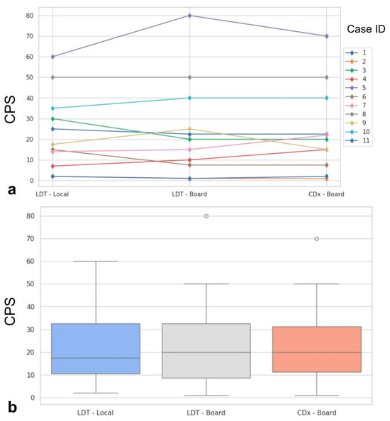 Spaghetti plot showing the case-by-case modifications of the PD-L1 CPS from LDT evaluated by local pathologist, LDT evaluated by the board, and CDx evaluated by the board (a). In (b), boxplots show the distribution of PD-L1 CPS in the three evaluation sets. ID: identifier; PD-L1: programmed death ligand 1; CPS: combined positive score; LDT: laboratory-developed test; CDx: companion diagnostic.