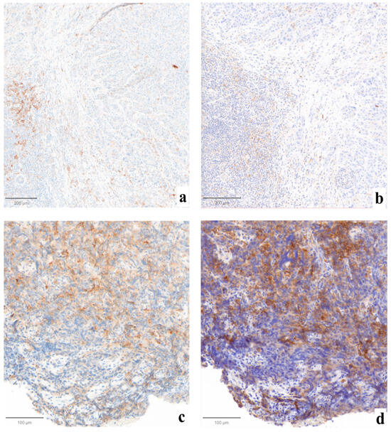 Examples of cases affected by interpretative variability due to technical factors. In case n° 7, sharper staining was obtained with LDT ((a), ×10), where fewer positive cells were counted, as compared to the more intense CDx-derived preparation ((b), ×10) that received a higher CPS. Case n°1 was affected by significant crush artifacts both on LDT-stained ((c), ×10) and CDx-stained ((d), ×10) tissues, complicating the single-cell localization of the positivity by pathologists.