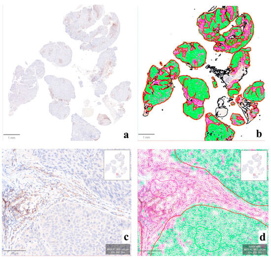 Output of the computational analysis performed on QuPath. In this case (n° 10), the original IHC slide ((a), ×1) was processed for the automatic detection of tumor (green) vs. non-tumor (violet) cells ((b), ×1), allowing the subsequent comparative analysis between compartments and assays. A closer look at the tumor–stromal interface ((c), ×10) demonstrates the impact of the evaluation of immune-positive cells in this region for the elaboration of CPS, easily computable through the application of the proposed QuPath pipeline ((d), ×10).