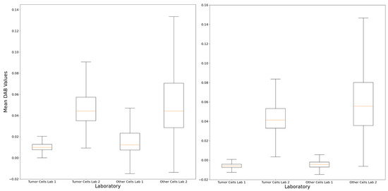 The computational analysis demonstrated differences in terms of DAB staining features within the tumor and non-tumor regions between the LDT and CDx preparations, as demonstrated by the boxplots of case n° 9 (left) and n° 11 (right), confirming the possible analytical reasons for the interpretation variability described. Lab 1: original local laboratory; Lab 2: reference laboratory.