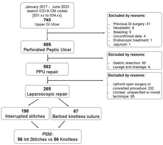 - Costa, G.; Fransvea, P.; Lepre, L.; Liotta, G.; Mazzoni, G.; Biloslavo, A.; Bianchi, V.; Costa, A.; Sganga, G.; Agresta, F.; et al. Perforated peptic ulcer (PPU) treatment: An Italian nationwide propensity score-matched cohort study investigating laparoscopic vs open approach. Surg. Endosc. 2023, 37, 5137–5149. [Google Scholar] [CrossRef] [PubMed]