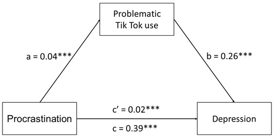 Indirect effect of procrastination on depression through problematic TikTok use. Standardized regression coefficients (β) are presented on the image. N = 448. *** p < 0.001.