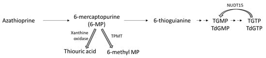 - Dean, L. Azathioprine Therapy and TPMT and NUDT15 Genotype. In Medical Genetics Summarie; Pratt, V.M., Scott, S.A., Pirmohamed, M., Esquivel, B., Kattman, B.L., Malheiro, A.J., Eds.; National Center for Biotechnology Information: Bethesda, MD, USA, 2012. [Google Scholar]