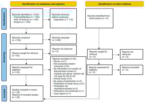 The study selection process is summarized in Figure 1. The search strategy in the databases resulted in 633 papers (109 in PubMed/Medline, 195 in Web of Science, 329 in Scopus). A total of 115 articles were cited in more than one database (duplicates). The reviewers independently screened the titles and abstracts of the remaining entries, leading to the exclusion of 455 articles as the studies were not related to the subject. Of the full-text reports of the remaining 63 articles, there was a lack of information concerning either the number of failures or the total number of implants in cases with perforated sinus membrane in 8 studies. The authors of these 8 studies were contacted by e-mail up to three times asking for missing essential information for the analyses, but none of them replied. Other 26 studies did not fulfill the eligibility criteria. Hand-searching of journals and of the reference lists of selected studies did not yield additional papers. Thus, 29 studies were included in the review.