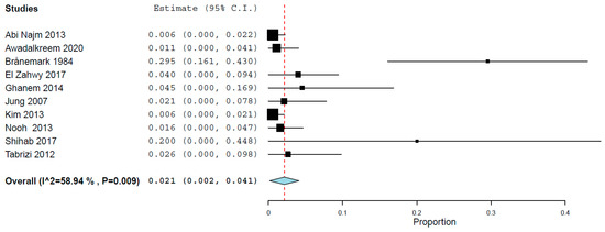 Ten studies reported the failure rate of implants when these perforated the floor of the maxillary sinus during placement. The estimated failure rate was of 2.1% (95% confidence interval 0.2%, 4.1%; standard error 1.0%, p = 0.035; heterogeneity: τ2 = 0.000, Chi2 = 21.917, I2 = 58.936, p = 0.009) (Figure 2). If the study of Brånemark et al. [25], with turned (machined) implants, is not included, the estimated failure rate goes down to 1.0% (95% confidence interval 0.0%, 1.9%; standard error 0.5%, p = 0.048; heterogeneity: τ2 = 0.000, Chi2 = 4.744, I2 = 0.000, p = 0.785).