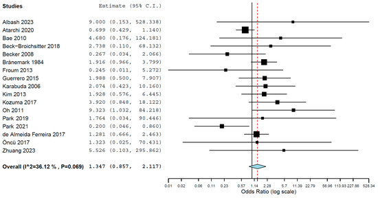 Seventeen studies reported the results of implant failure for two groups, namely, patients that presented and did not present sinus membrane perforation during the sinus lift procedure. A random-effects model was used to evaluate the comparison of the implant failure between the groups, due to heterogeneity (τ2 = 0.241, Chi2 = 25.048, I2 = 36.121, p = 0.069). The pairwise meta-analysis showed implants placed in augmented sinuses in which the membrane was perforated did not have a higher risk of failure than implants placed in sinuses with no perforated membrane, with an OR 1.347 (95% confidence interval, 0.857, 2.117, p = 0.197; Figure 3). However, the effect size was not statistically significant.