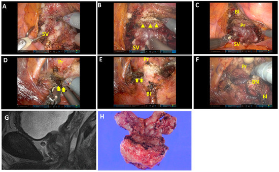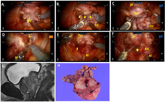 Surgical techniques of the retrotrigonal layer dissection from the posterior approach and bladder neck preservation in patients with an enlarged prostate. (A) Isolation of the seminal vesicle and dissection of deferens vasa in a posterior approach. (B) The retrotrigonal layer, pinkish longitudinal tissue, is transected (triangles). (C) The surface of the prostatic pseudocapsule can easily be identified after transection. This layer can be developed anteriorly. (D) Right lateral approach in bladder neck dissection. (E) Detrusor muscles are detached from the prostate. The posterior space is visible laterally (arrows). (F) The bladder neck is preserved (arrows). (G,H) MRI sagittal view and macroscopic findings of the prostate and seminal vesicle. Enlargement of the prostate gland is visible and the surface of the prostatic pseudocapsule at the protrusion site is exposed (H). SV, seminal vesicles; Bl, bladder; Pr, prostate; BN, bladder neck.
