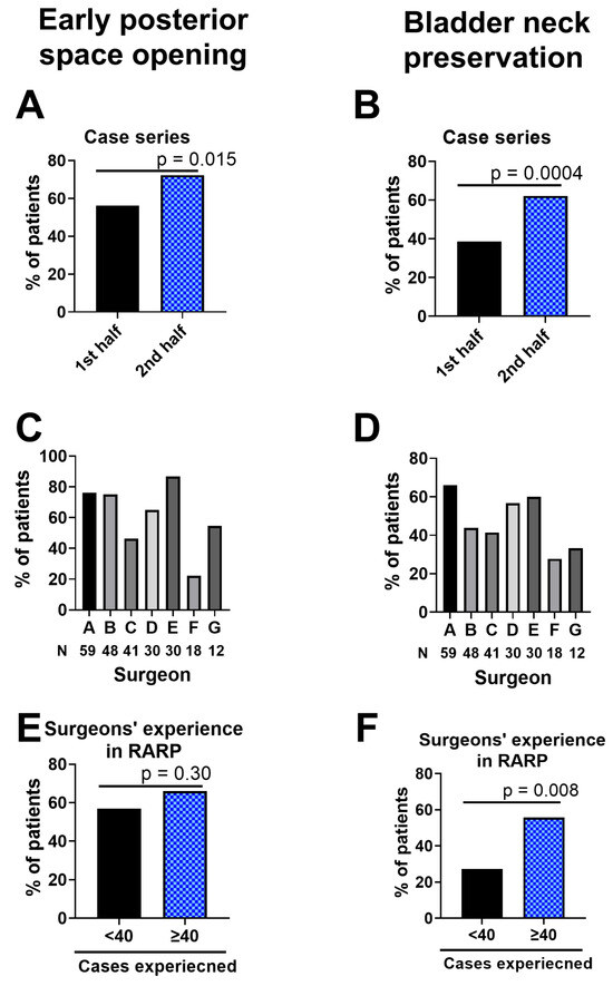 In 153 (64%) patients, the posterior space was successfully opened prior to the bladder neck opening from the anterior perspective. The success rate increased from 56% (67 out of 119) in the first half of the series to 72% (86 out of 119) in the latter half (p = 0.015) (Figure 3A). In 120 (53%) patients, the bladder neck was successfully preserved. The success rate for bladder neck preservation grew from 39% (46 out of 119) in the initial series half to 63% (74 out of 119) in the latter half (p = 0.0004) (Figure 3B). The success rate in the early posterior opening and bladder neck preservation depended on the surgeons (up to 87% in the early posterior opening; 66% in the bladder neck preservation) and their experience in RARP (Figure 3C–F). A positive association was evident between the success in bladder neck preservation and the prior opening of the posterior space (61% [94 out of 153 in the prior opening of the posterior space (+)] vs. 30% [26 out of 85 in the prior opening of the posterior space (–)], p < 0.0001). Conversely, both large prostate volume and prostate protrusion were negatively associated with bladder neck preservation success (33% [13 out of 39] in prostate volume ≥ 50 mL vs. 54% [101 out of 188] in prostate volume < 50 mL, p = 0.023; 40% [22 out of 55] in protrusion (+) vs. 54% [92 out of 172] in protrusion (–), p = 0.09). Among the 63 patients with a large prostate (volume ≥ 50 cm3) and/or positive prostate protrusion, 7 (11%) needed bladder neck reconstruction.