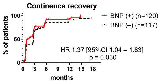 Continence recovery in cases with (red line) and without bladder neck preservation (black dashed line). Continence recovery was superior in cases with bladder neck preservation compared to those without. BNP, bladder neck preservation; HR, hazard ratio; CI, confidence interval.