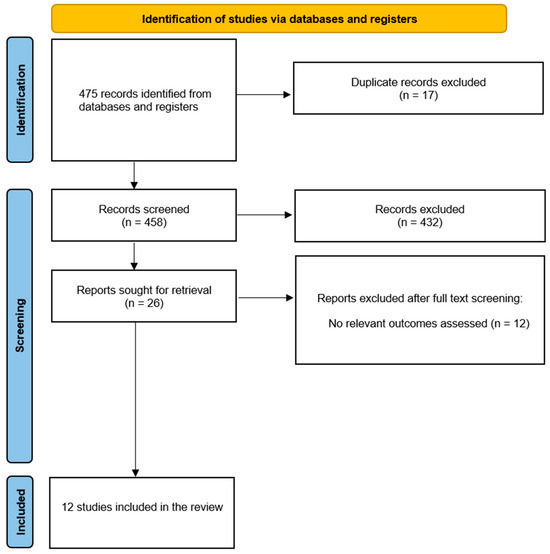 A total of 475 abstracts were retrieved from the searches (Figure 2). After removal of duplicate entries, 459 articles were screened, of which 432 were excluded on the basis of titles and abstracts; a total of 26 relevant publications were retrieved for further assessment. Twelve studies [14,15,16,17,18,19,20,21,22,23,24,25], analysing a total of 1584 participants receiving TAVR explant, met the inclusion criteria and were included in the quantitative analysis. A summary of the characteristics of the studies included is reported in Table 1. There was no disagreement among the reviewers as to the selection of the studies. A summary of the judgements regarding potential sources of bias in the studies is presented in Table 2.
