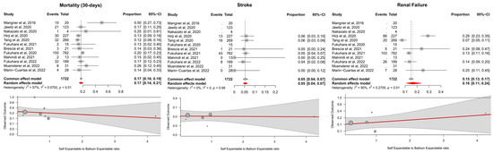 A metaregression was performed to investigate the role of the ratio between self-expandable valves and balloon-expandable valves as a moderator on the primary outcomes. The type of transcatheter devices used during the index procedures did not significantly affect the incidence of mortality (p = 0.493), stroke (p = 0.941), or renal injury (p = 0.333).