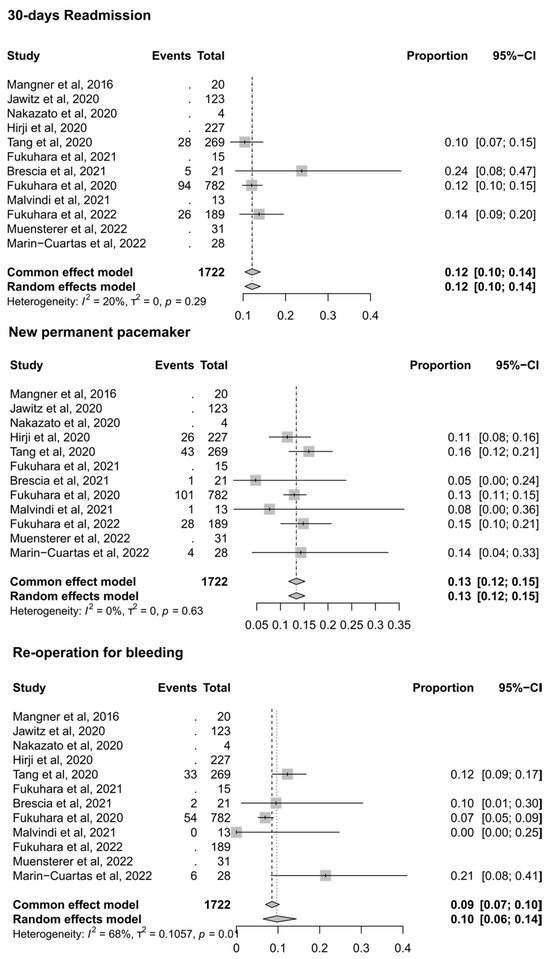 Additional analyses were performed for secondary outcomes (Figure 4). Readmissions at 30 days were 12% (four studies; proportion 0.12; 95% CI, 0.10–0.14; I2 = 20%). A need for a new permanent pacemaker insertion occurred in 13% of cases (seven studies; proportion 0.13; 95% CI, 0.12–0.15; I2 = 0%). A re-operation for bleeding was required in 10% of the cases (five studies; proportion 0.10; 95% CI, 0.06–0.14; I2 = 68%); moderate heterogeneity could be appreciated across the studies reporting this outcome.