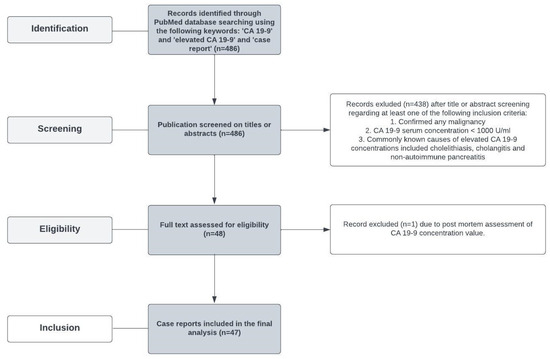 To assess the non-cancerous causes of a significantly elevated CA 19-9 concentration, the PubMed database was searched using the following terms: ‘CA 19-9’ and ‘CA 19-9 elevation’ and ‘case report’. Then, 486 records were identified and screened on titles and abstracts. There were 439 patients who met at least one of the following criteria: any confirmed malignancy [1], CA 19-9 < 1000 U/mL [2]; common non-cancerous causes of CA 19-9 including cholelithiasis, cholangitis, and non-autoimmune pancreatitis [3] were excluded. Forty-eight case reports were assessed. A single case was excluded due to post-mortem CA 19-9 assessment. Finally, 47 cases were included in the final analysis. The flow chart for study selection is presented in Figure 1.