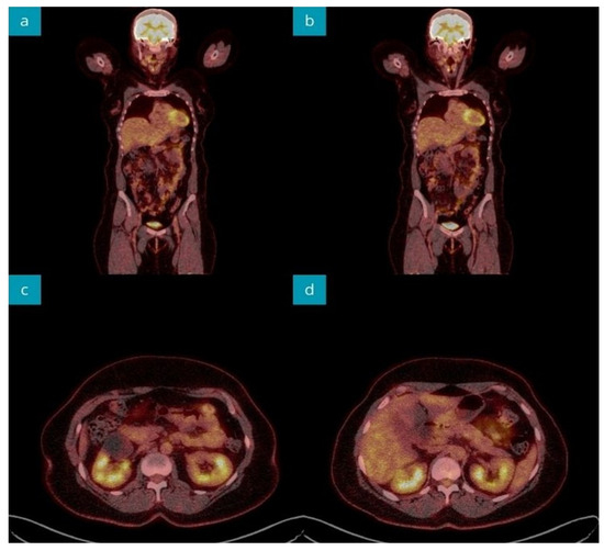 18F-FDG PET-CT imaging during the primary diagnostic process revealed abdominal organs without pathological 18F-FDG uptake. Coronal sections (a,b). Axial sections of pancreatic head (c), body, and tail (d).