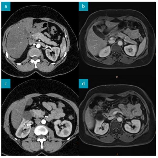 The abdominal CT imaging during the primary diagnostic work-up (a,c), and MRI after 15 months of follow-up (b,d). The head (mildly enlarged), body, and tail of the pancreas show normal structure. Normal pancreas image in MRI performed 15 months later.