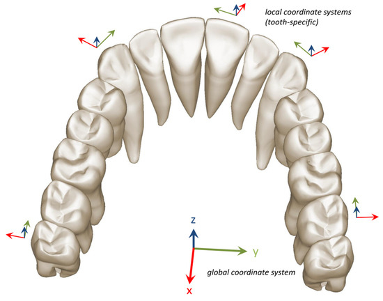 Illustration of an exemplary upper arch with global coordinate system (tall) and several tooth-specific coordinate systems (small). Tooth movements with course on the tooth-specific coordinate system along the x-axis correspond to mesio-distal movements, along the y-axis to orovestibular movements and along the z-axis to intrusions versus extrusions.