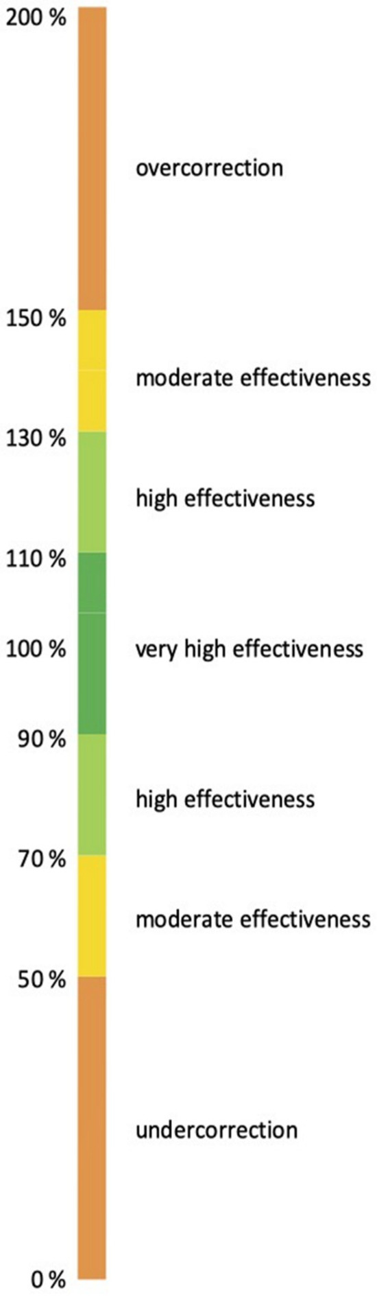 Rating scale for the categorization of results. Colored bars correlate with the mean relative effectivity and its corresponding interpretations. Values between 0 and 49% indicate a correction below the expected result, 50–69% and 131–150% a moderate effectivity, 70–89% and 111–130% a high effectivity, 91–110% a very high effectivity and 151% or higher an overcorrection.