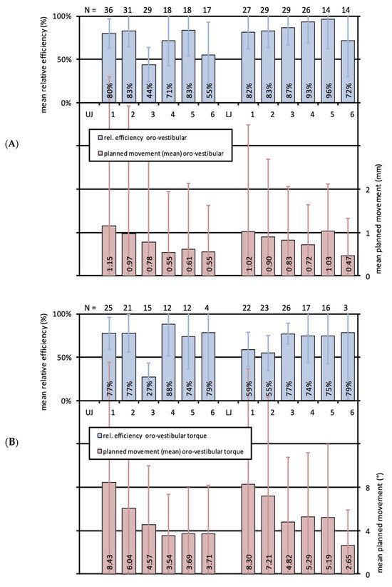 (A) Bar graph illustrating the relative effectivity of translational orovestibular tooth movements for the whole study cohort. Upper bars (blue) indicate the relative effectivity and the error in percent for each tooth of the upper (UJ, left) and the lower (LJ, right) jaw. Lower bars (red) show the mean planned movements in mm with standard deviations (SD). N-numbers of the corresponding mean values are specified on top of the illustration. (B) Bar graph illustrating the relative effectivity of rotations around the y-axis, equivalent to orovestibular torque, for the whole study cohort. Upper bars (blue) indicate the relative effectivity and the error in percent for each tooth of the upper (UJ, left) and the lower (LJ, right) jaw. Lower bars (red) show the mean planned movements in mm with standard deviations (SD). N-numbers of the corresponding mean values are specified on top of the illustration.