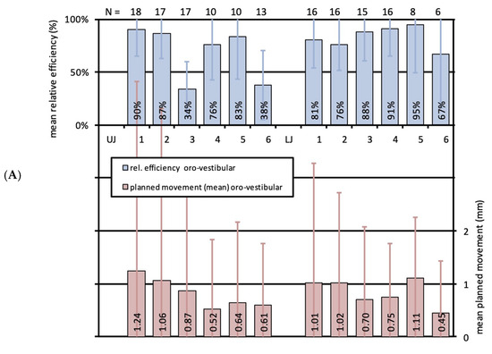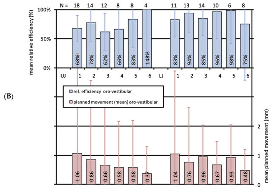 Most extent orovestibular movements were planned for upper and lower first incisors with 1.0 mm and 1.2 mm, and featured efficiencies of 80% and 82%, respectively (Figure 4A). Lower second premolars showed a very high effectivity of 96% for a similar amount of movement, and lower first premolars also presented a very high effectivity of 93% for 0.7 mm planned movement. Second incisors of both jaws, upper premolars, lower canines and lower molars manifested a high effectivity between 71 and 87% for mean planned movements of 0.5–1.0 mm. Exclusively the upper canines with 44% and upper molars with 55% could only reach a correction below the expected result or a moderate effectivity for 0.8 and 0.5 mm movement, respectively. Statistical outcomes did not significantly differ among single teeth or between upper and lower jaws.