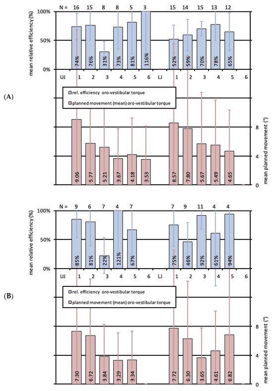 (A) Bar graph illustrating the relative effectivity of rotations around the y-axis, equivalent to orovestibular torque, for Group 1 (adults, Invisalign®). Upper bars (blue) indicate the relative effectivity and the error in percent for each tooth of the upper (UJ, left) and the lower (LJ, right) jaw. Lower bars (red) show the mean planned movements in mm with standard deviations (SD). N-numbers of the corresponding mean values are specified on top of the illustration; (B) Bar graph illustrating the relative effectivity of rotations around the y-axis, equivalent to orovestibular torque, for Group 2 (adolescents, Invisalign® Teen). Upper bars (blue) indicate the relative effectivity and the error in percent for each tooth of the upper (UJ, left) and the lower (LJ, right) jaw. Lower bars (red) show the mean planned movements in mm with standard deviations (SD). N-numbers of the corresponding mean values are specified on top of the illustration.