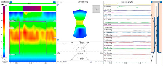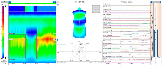 HR-ARM procedure was conducted using MMS Laborie equipment with a 24-channel solid-state catheter. The catheter was inserted to the appropriate depth as recommended by the manufacturer, and a water-based lubricant (OptiLube™) was used. The test was conducted on awake patients, and bowel preparation was not performed routinely unless the patient’s rectum was impacted with stool—in such cases, rectal enema was performed either the day before or a few hours prior to the examination. Each examination was performed by a single physician trained for HR-ARM. For most cases, we ran (if possible) a 3-minute adaptation period prior to the examination. The test involved assessment of anal canal resting pressure for ca. 30 s (this part was omitted in non-cooperating patients). Next, the presence of rectoanal inhibitory reflex (RAIR) was assessed by inflating the balloon with air volume starting with 5 mL and increasing by another 5 mL each time until RAIR was elicited, the patient presented discomfort or up to 60 mL. RAIR was considered present when a pressure drop of at least 25% or 10 mmHg was observed. Examples of present and absent RAIR are presented in Figure 1 and Figure 2.