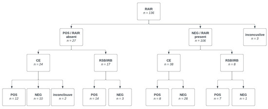 All patients with clinical suspicion of HD were examined with HR-ARM. For patients with absence of RAIR (positive test for HD), additional tests such as contrast enema (CE) and/or suction rectal biopsy (RSB) were performed. In cases when RSB was inconclusive, full-thickness biopsy (FTB) was carried out. In instances where RAIR was present, further diagnostics were not routinely pursued, and the patient was diagnosed as non-HD. However, exceptions were made for patients displaying typical HD symptoms (e.g., bloating, severe constipation, poor weight gain, progressive cachexia or enterocolitis). Such patients were referred for supplementary tests. Ultimately, the final confirmation of HD relied on the results of either rectal suction biopsy (RSB) or full-thickness biopsy (FTB). Conversely, the exclusion of HD was established through clinical follow-up or negative biopsy outcomes (Figure 3).