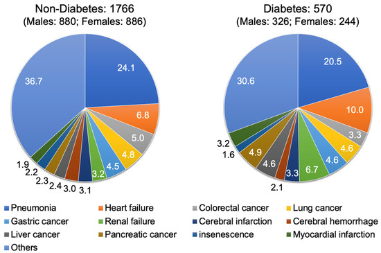 As shown in Table S1, the leading cause of death in the total number of individuals was pneumonia (23.2%) followed by heart failure (7.6%) and lung cancer (4.8%). In individuals without diabetes, the leading cause of death was pneumonia (24.1%) followed by heart failure (6.8%) and colorectal cancer (5.0%) (Figure 1). In individuals with diabetes, the leading cause of death was pneumonia (20.5%) followed by heart failure (10.0%) and renal failure (6.7%) (Figure 1).