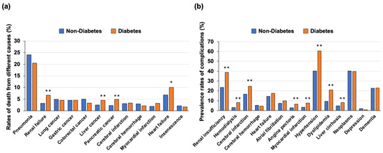 (a) Rates of death from different causes in individuals with and those without diabetes. (b) Rates of complications in individuals with and those without diabetes * p < 0.05, ** p < 0.01.