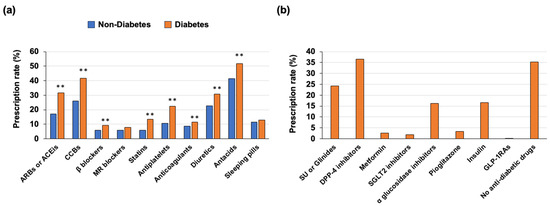 We analyzed the medications used in the outpatient clinic before death in individuals with diabetes and those without diabetes (Figure 3a,b). The prescription rates of ARBs or ACEis, CCBs, β-blockers, statins, antiplatelets, anticoagulants, diuretics and antacids were significantly higher in the individuals with diabetes than in individuals without diabetes (Figure 3a). The prescription rates of MR blockers and sleeping pills were not significantly different between the individuals with diabetes and those without diabetes (Figure 3a).