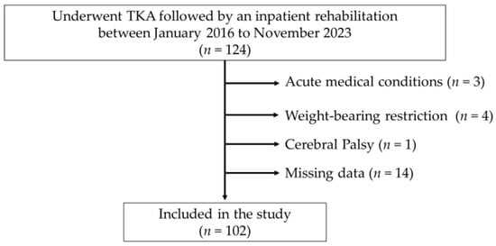 The participant recruitment flowchart is depicted in Figure 1. During the study period, 124 patients underwent TKA. Three patients were transferred to other hospitals after surgery due to acute medical conditions (acute heart failure, electrolyte abnormality, and surgical site infection). In addition, the following patients were excluded: three patients requiring weight-bearing restrictions on the operated leg because of a patellar fracture, one requiring weight-bearing restrictions on the contralateral leg owing to a tibial fracture, and one with cerebral palsy. Furthermore, fourteen patients with missing baseline data were also excluded from the study. The remaining 102 patients were included in this study.