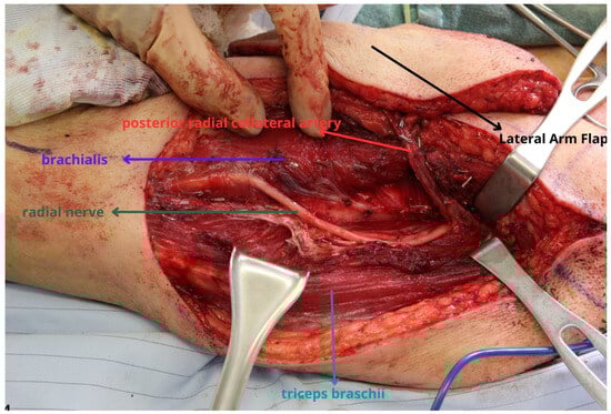 - Chang, E.I.; Ibrahim, A.; Papazian, N.; Jurgus, A.; Nguyen, A.T.; Suami, H.; Yu, P. Perforator Mapping and Optimizing Design of the Lateral Arm Flap: Anatomy Revisited and Clinical Experience. Plast. Reconstr. Surg. 2016, 138, 300e–306e. [Google Scholar] [CrossRef] [PubMed]