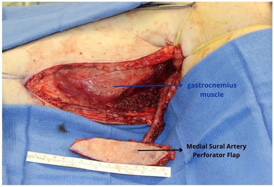 - Daar, D.A.; Abdou, S.A.; Cohen, J.M.; Wilson, S.C.; Levine, J.P. Is the Medial Sural Artery Perforator Flap a New Workhorse Flap? A Systematic Review and Meta-Analysis. Plast. Reconstr. Surg. 2019, 143, 393e–403e. [Google Scholar] [CrossRef]