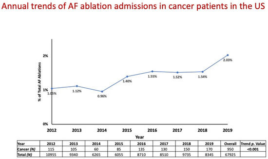 Using data from the NIS, the largest all-payer inpatient database in the United States, we analyzed a weighted total of 67,915 catheter ablation procedures for AF, between January 2012 and December 2019. Real-world nationwide data showed that 950 patients (1.4%) undergoing AF ablation had a cancer diagnosis. Annual trend analysis showed a gradual and significant increase in AF catheter ablations for cancer patients between 2012 and 2019. Cancer patients undergoing AF catheter ablation were older, had more comorbidities and elevated thrombotic as well as bleeding risks, reflected by higher CHA2DS2-VASc and ATRIA bleeding indices, compared to their non-cancer counterparts. However, despite a higher rate of total complications among cancer patients, driven by infectious and bleeding complications, no significant differences were observed in cardiac complications, periprocedural stroke or in-hospital mortality rates.