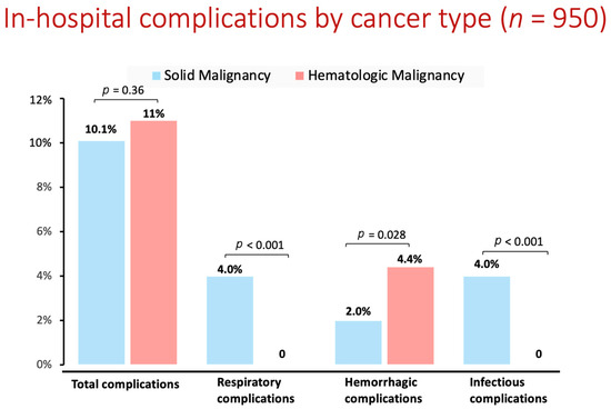 Analysis of in-hospital complications by cancer type showed no significant difference in the total complication rate between patients with solid or hematologic malignancies (10.1% vs. 11%, p = 0.36). However, patients with hematologic cancer had a significantly higher rate of bleeding complications, while those with solid cancer had higher rates of post-procedural respiratory failure and infectious complications (Figure 3).