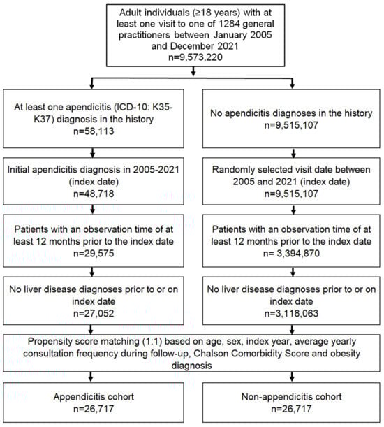 All patients had an observation period of at least twelve months before the index date. Patients with a diagnosis of liver disease (ICD-10: B18, K70-K77) before inclusion were excluded to estimate the association between appendicitis and MASLD without the influence of other liver diseases. After applying similar inclusion criteria, individuals without appendicitis were matched to those with appendicitis using nearest neighbor propensity score matching (1:1) based on age, sex, index year, average annual consultation frequency during follow-up, baseline diagnosis of obesity as a major risk factor for MASLD, and Charlson comorbidity score [18]. For the non-appendicitis cohort, the index date was that of a randomly selected visit between January 2005 and December 2021 (Figure 1). The inclusion of average annual consultation frequency during follow-up was needed to avoid selection bias, as patients with appendicitis may visit physicians more frequently after appendicitis therapy.