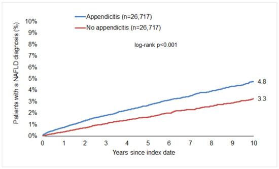 The outcome of the study was the initial diagnosis of NAFLD/MASLD (ICD-10: K75.8, K76.0) in the up to 10 years after the index date as a function of appendicitis. Differences in the sample characteristics and diagnosis prevalence between the appendicitis and non-appendicitis cohorts were compared using the Wilcoxon signed-rank test for continuous variables and the McNemar and the Stuart–Maxwell tests for categorical variables. The 10-year cumulative incidence of MASLD in the appendicitis and non-appendicitis cohorts was analyzed using Kaplan–Meier curves and compared using the log-rank test. Univariable Cox regression analyses were performed to assess the association between appendicitis and MASLD in the total cohort, in the five age groups, in women and men, as well as in patients with and without diabetes and obesity, separately. A p-value of <0.05 was considered statistically significant. Analyses were performed using SAS version 9.4 (SAS Institute, Cary, NC, USA).