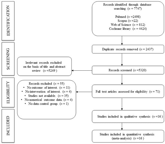 The search strategy recovered a total of 7747 studies from four databases (PubMed, n = 2498; Scopus, n = 22; Web of Science, n = 812; and Cochrane library, n = 4424), of which 71 were assessed in full text. 55 studies were excluded for the following reasons: no outcome of interest (n = 11), no intervention of interest (n = 4), studies not available (n = 35), no numerical outcome data (n = 4), and no data control group (n = 1). Finally, we included 16 studies in both the systematic review and meta-analysis. (Figure 1).
