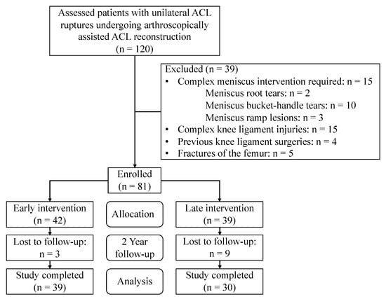 - Shen, X.; Liu, T.; Xu, S.; Chen, B.; Tang, X.; Xiao, J.; Qin, Y. Optimal Timing of Anterior Cruciate Ligament Reconstruction in Patients With Anterior Cruciate Ligament Tear: A Systematic Review and Meta-analysis. JAMA Netw. Open 2022, 5, e2242742. [Google Scholar] [CrossRef] [PubMed]