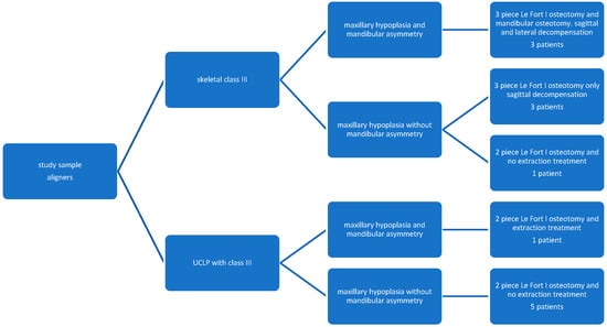 Thirteen patients treated with Invisalign aligners in preparation for segmental maxillary surgery were included in the study sample. The case-series included seven patients with severe transversal and vertical maxillary hypoplasia with no associated craniofacial anomalies and six patients with unilateral cleft lip and palate (UCLP) aged 19 to 27 (average 22.2 ± 2.9) (Figure 1). All consecutive patients undergoing orthodontic treatment with aligners in preparation of segmental maxillary osteotomies were included in this study, those undergoing one piece le Fort osteotomy were excluded. Regarding maxillary segmentation, surgery six patients in the study sample underwent a 3-piece Le Fort I osteotomy, while seven underwent a 2-piece LeFort 1 osteotomy. One of the UCLP patients and three of the non-cleft patients presented also mandibular asymmetry. These patients also needed an orthodontic pre-surgical lateral decompensation to prepare for the mandibular osteotomy. All patients of the sample underwent sagittal orthodontic decompensation. One patient with UCLP and a non-cleft patient followed an extraction treatment. The UCLP patient with mandibular asymmetry underwent an extraction treatment to centre the mandibular midline, avoid the mandibular osteotomy (Figure 2).