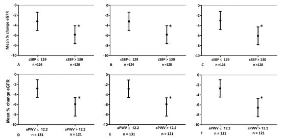 Association between baseline cSBP (panel A–C) or baseline aPWV (panel D–F) and percentage change in eGFR (n = 252): (A) adjusted for baseline eGFR; (B) adjusted for baseline eGFR, BMI, and DM; (C) adjusted for baseline eGFR, BMI, DM, the use of ACE inhibitors and beta blockers; (D) adjusted for baseline eGFR; (E) adjusted for baseline eGFR, BMI, DM, and hypertension; (F) adjusted for baseline eGFR, BMI, DM, hypertension, the use of ACE inhibitors and beta blockers. Dots represent means and bars represent 95% confidence interval. Significant differences between groups are marked with an asterisk (*). Abbreviations: aPWV, aortic pulse wave velocity; BMI, body mass index; cSBP, central systolic blood pressure; DM, diabetes mellitus; eGFR, estimated glomerular filtration rate.
