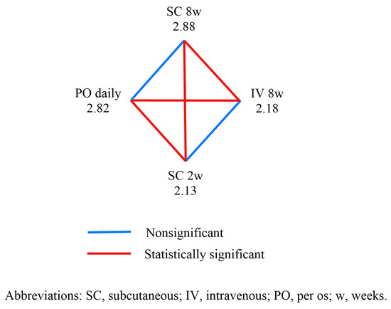 The highest score was observed for SC every 8 weeks at 2.88, although it was nonsignificant compared to per os (PO) every day, which scored 2.82. Both routes of administration were significantly more preferred than IV every 8 weeks and SC every 2 weeks. No statistically significant difference was found between the preferences for IV every 8 weeks and SC every 2 weeks.